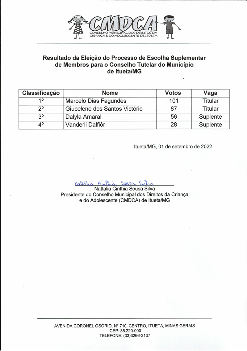 O Conselho Municipal dos Direitos da Criança e Adolescente (CMDCA) do Município de Itueta/MG, no uso de suas atribuições legais, conforme preconiza a Lei 8.069/90 - Estatuto da Criança e do Adolescente, a Lei Municipal nº 334/2019 e a Resolução nº 170/2014 do Conselho Nacional dos Direitos da Criança e do Adolescente - CONANDA torna público o RESULTADO DA ELEIÇÃO do Processo de Escolha Suplementar para membros do Conselho Tutelar para o período 2022/2023 sendo realizado sob a responsabilidade deste e a fiscalização do Ministério Público, mediante as condições estabelecidas no Edital.
