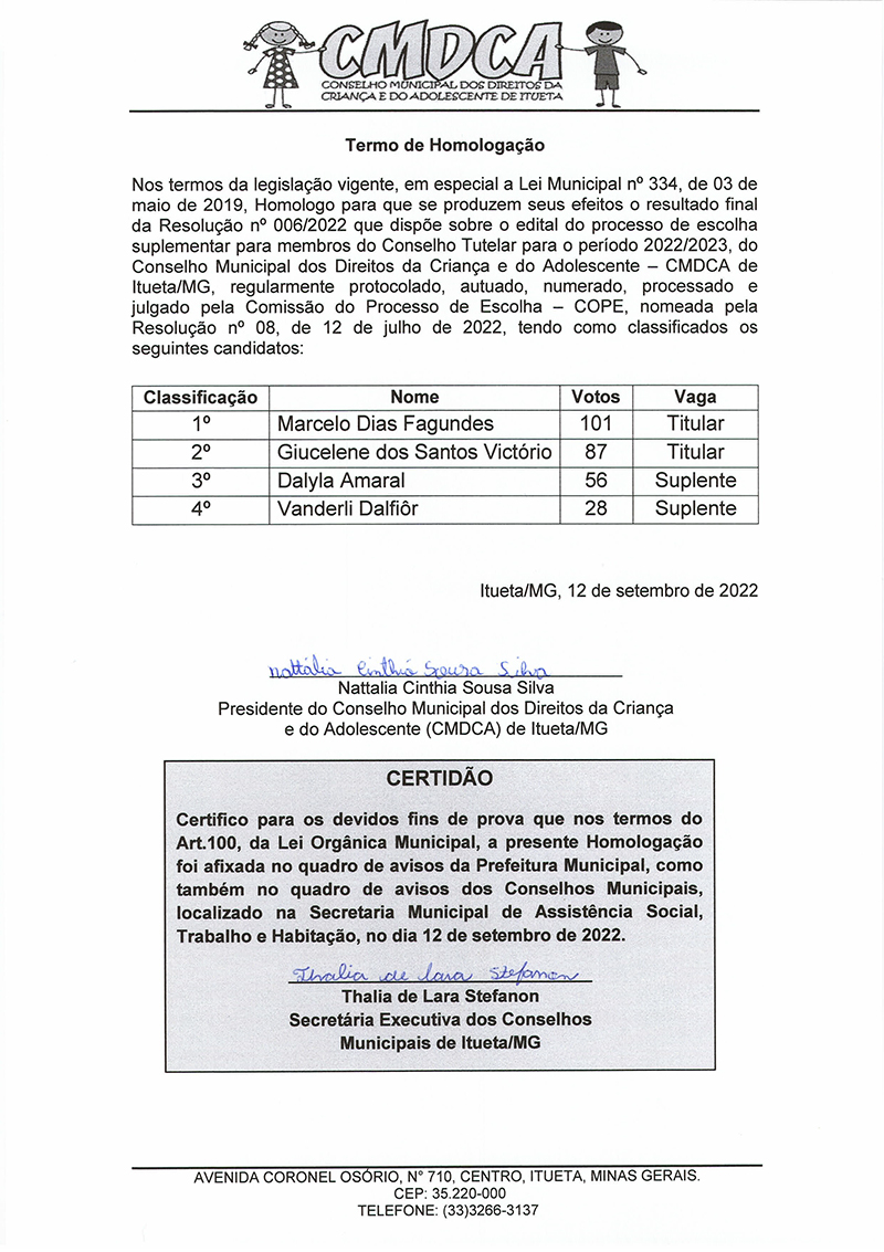 O Conselho Municipal dos Direitos da Criança e Adolescente (CMDCA) do Município de Itueta/MG, no uso de suas atribuições legais, conforme preconiza a Lei 8.069/90 - Estatuto da Criança e do Adolescente, a Lei Municipal nº 334/2019 e a Resolução nº 170/2014 do Conselho Nacional dos Direitos da Criança e do Adolescente - CONANDA torna público a HOMOLOGAÇÃO DO RESULTADO DA ELEIÇÃO do Processo de Escolha Suplementar para membros do Conselho Tutelar para o período 2022/2023 sendo realizado sob a responsabilidade deste e a fiscalização do Ministério Público, mediante as condições estabelecidas no Edital.