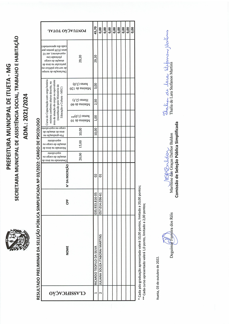 A Prefeitura Municipal de Itueta/MG, situada na Praça Antônio Barbosa de Castro, nº. 35, Centro, CEP nº. 35.220-000, por intermédio da Secretaria Municipal de Assistência Social, Trabalho e Habitação, no uso de suas atribuições legais, conferidas pela Lei Orgânica Municipal e Lei Complementar Municipal nº 002, de 04/04/2011, TORNA PÚBLICO, o RESULTADO PRELIMINAR para o processo de SELEÇÃO PÚBLICA SIMPLIFICADA, para provimento de vagas existentes (PSICÓLOGO) de acordo com o requisito da Lei Municipal n° 240, de 03 de Maio de 2011 e suas posteriores alterações, e o artigo 37, IX da Constituição Federal relacionadas nesse edital.