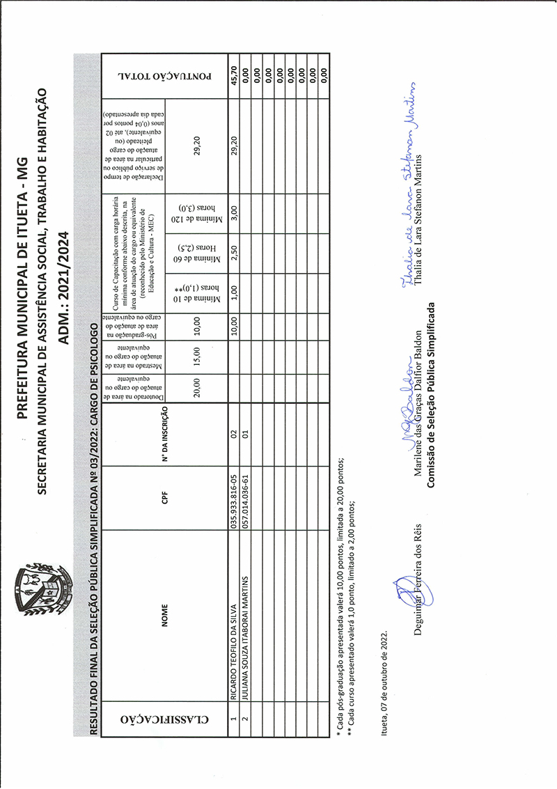 Resultado Final - Seleção Pública Simplificada nº 03/2022 (Psicólogo)