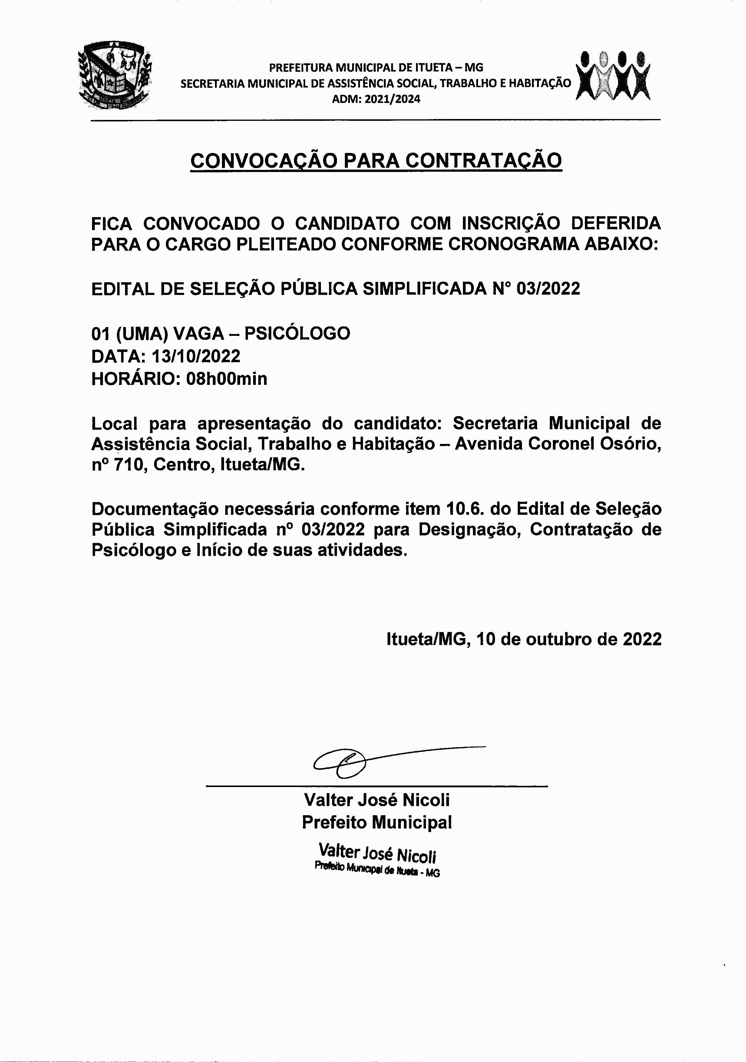 A Prefeitura Municipal de Itueta/MG, situada na Praça Antônio Barbosa de Castro, nº. 35, Centro, CEP nº. 35.220-000, por intermédio da Secretaria Municipal de Assistência Social, Trabalho e Habitação, no uso de suas atribuições legais, conferidas pela Lei Orgânica Municipal e Lei Complementar Municipal nº 002, de 04/04/2011, TORNA PÚBLICO, a CONVOCAÇÃO PARA CONTRATAÇÃO para o processo de SELEÇÃO PÚBLICA SIMPLIFICADA, para provimento de vagas existentes (PSICÓLOGO) de acordo com o requisito da Lei Municipal n° 240, de 03 de Maio de 2011 e suas posteriores alterações, e o artigo 37, IX da Constituição Federal relacionadas nesse edital.