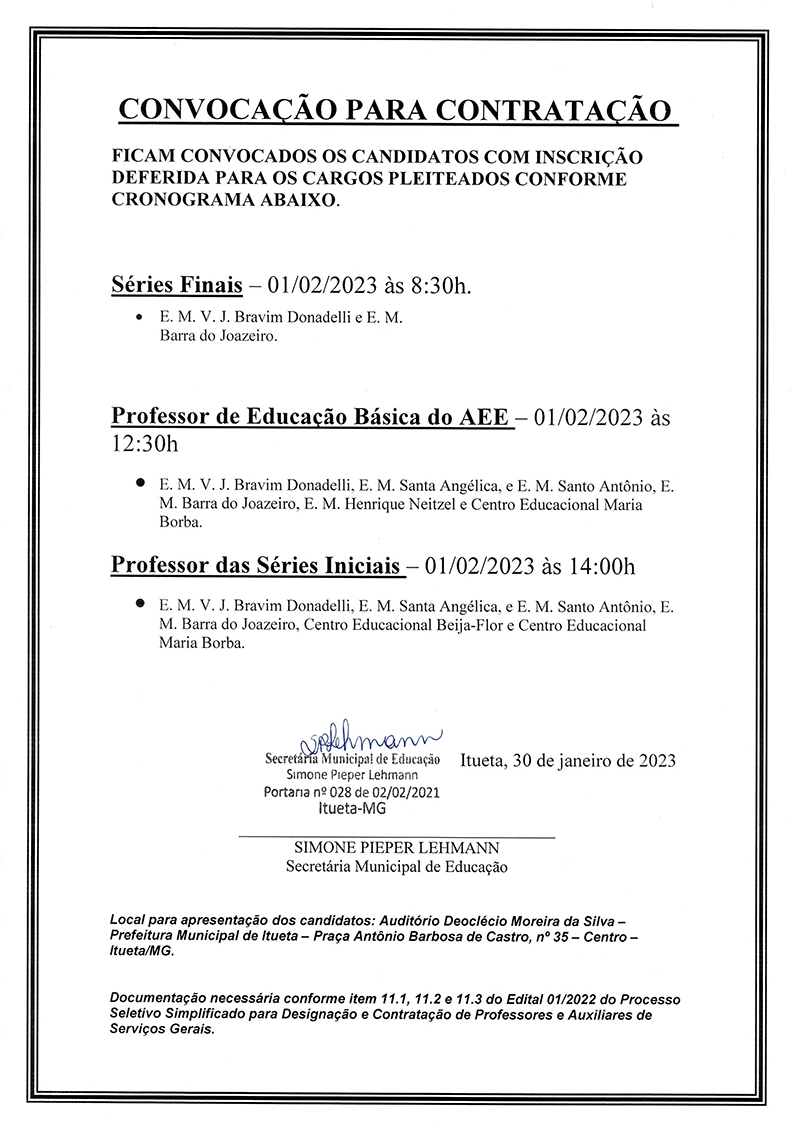 CONVOCAÇÃO PARA CONTRATAÇÃO - Processo Seletivo Simplificado - Edital nº 01/2022
