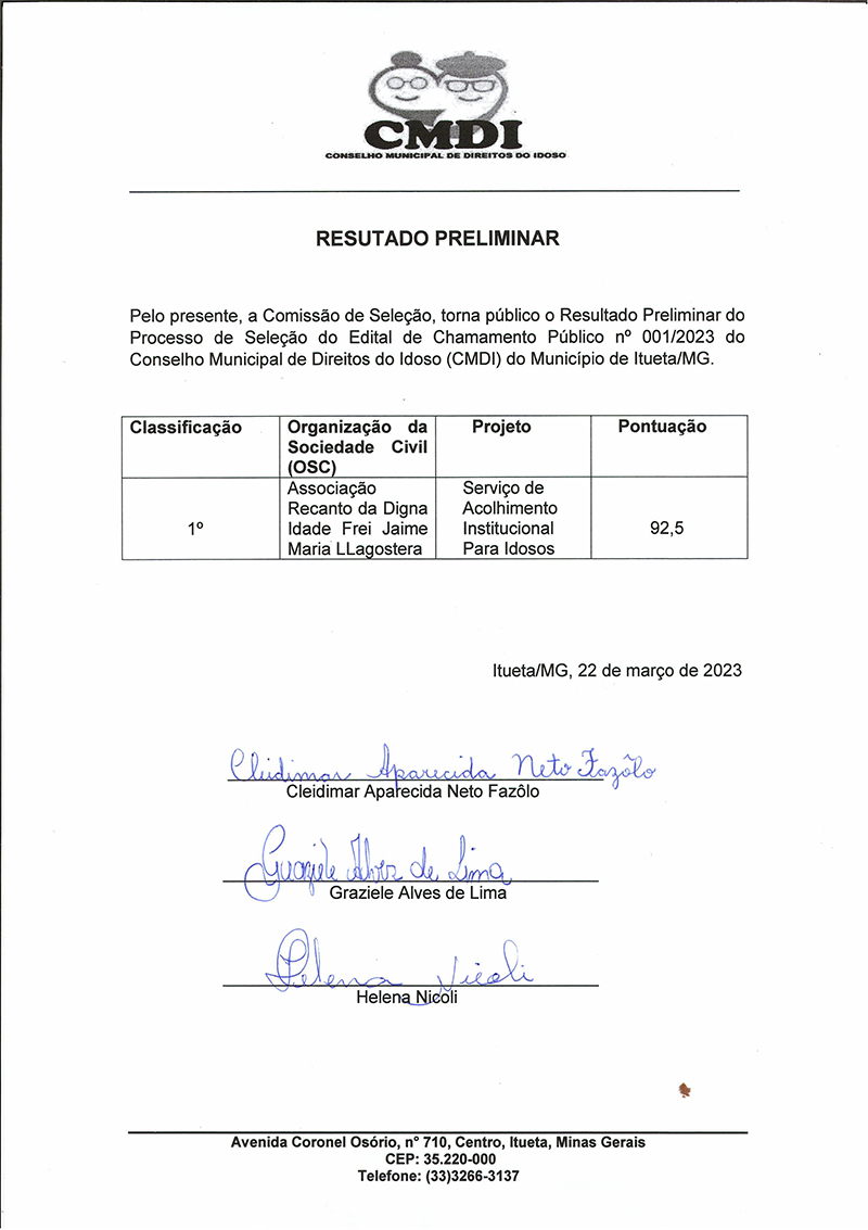 A PREFEITURA MUNICIPAL DE ITUETA-MG, por intermédio do Conselho Municipal de Direitos do Idoso – CMDI, com esteio na Lei Federal nº 13.019, de 31 de julho de 2014, torna público o RESULTADO PRELIMINAR do processo de seleção do Edital de Chamamento Público visando à seleção de propostas de organizações da sociedade civil interessadas em celebrar Termo de Fomento que tem por objeto a execução de projetos com as atividades relacionadas no edital.