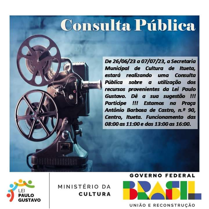 A Secretaria Municipal de Cultura de Itueta, estará realizando uma Consulta Pública, entre os dias 26/06/23 à 07/07/23, sobre a utilização dos recursos provenientes da Lei Paulo Gustavo. Dê a sua sugestão. Participe!!! Estamos na Praça Antônio Barbosa de Castro, n.º 90, Centro, Itueta-MG. Funcionamento das 08:00 às 11:00h e das 13:00 às 16:00h.