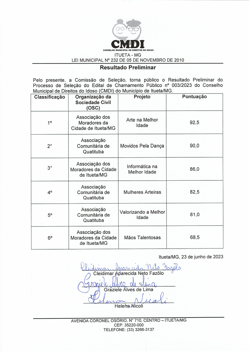 Página inicial > Últimas Notícias > Resultado Preliminar- Edital de Chamamento Público 003/2023 (CMDI)