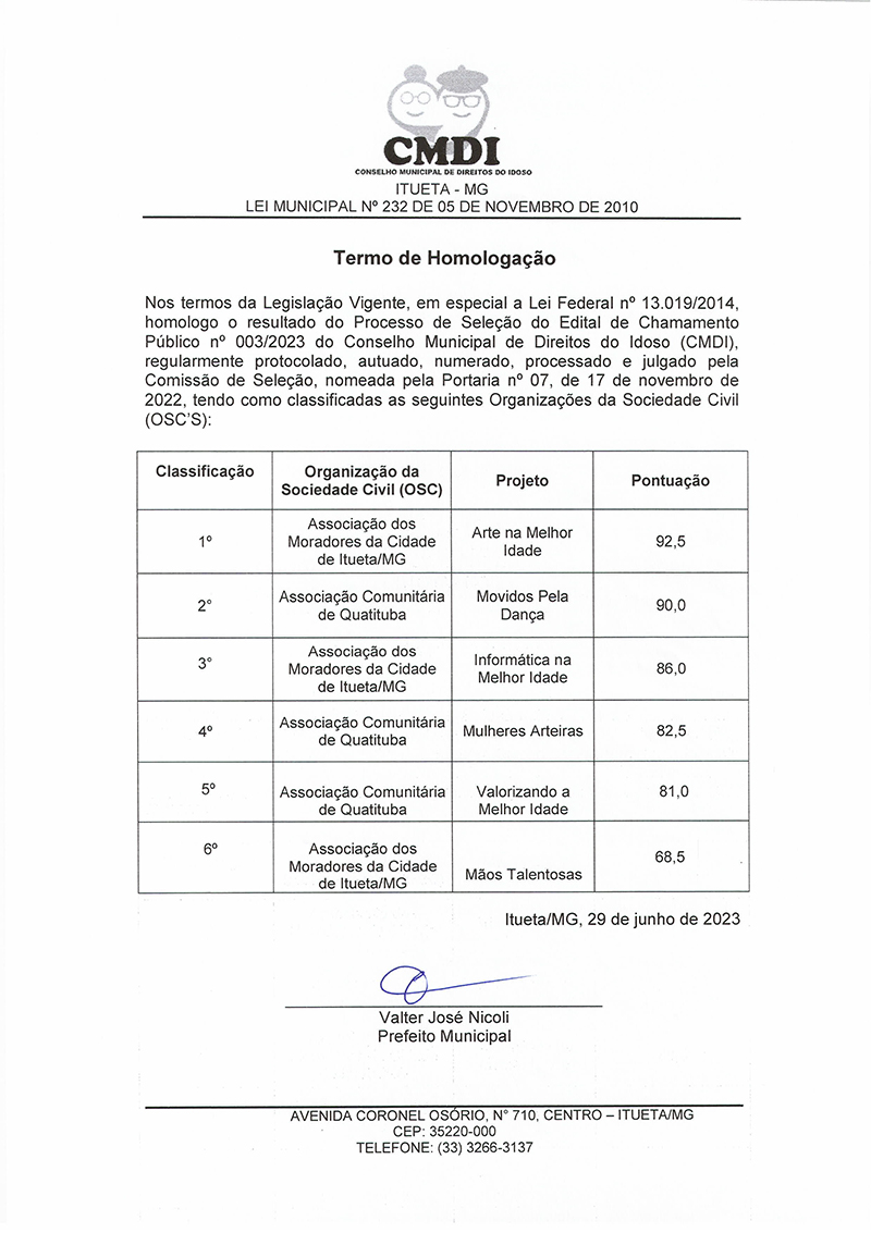 Página inicial > Últimas Notícias > Termo de Homologação - Edital de Chamamento Público 003/2023 (CMDI)