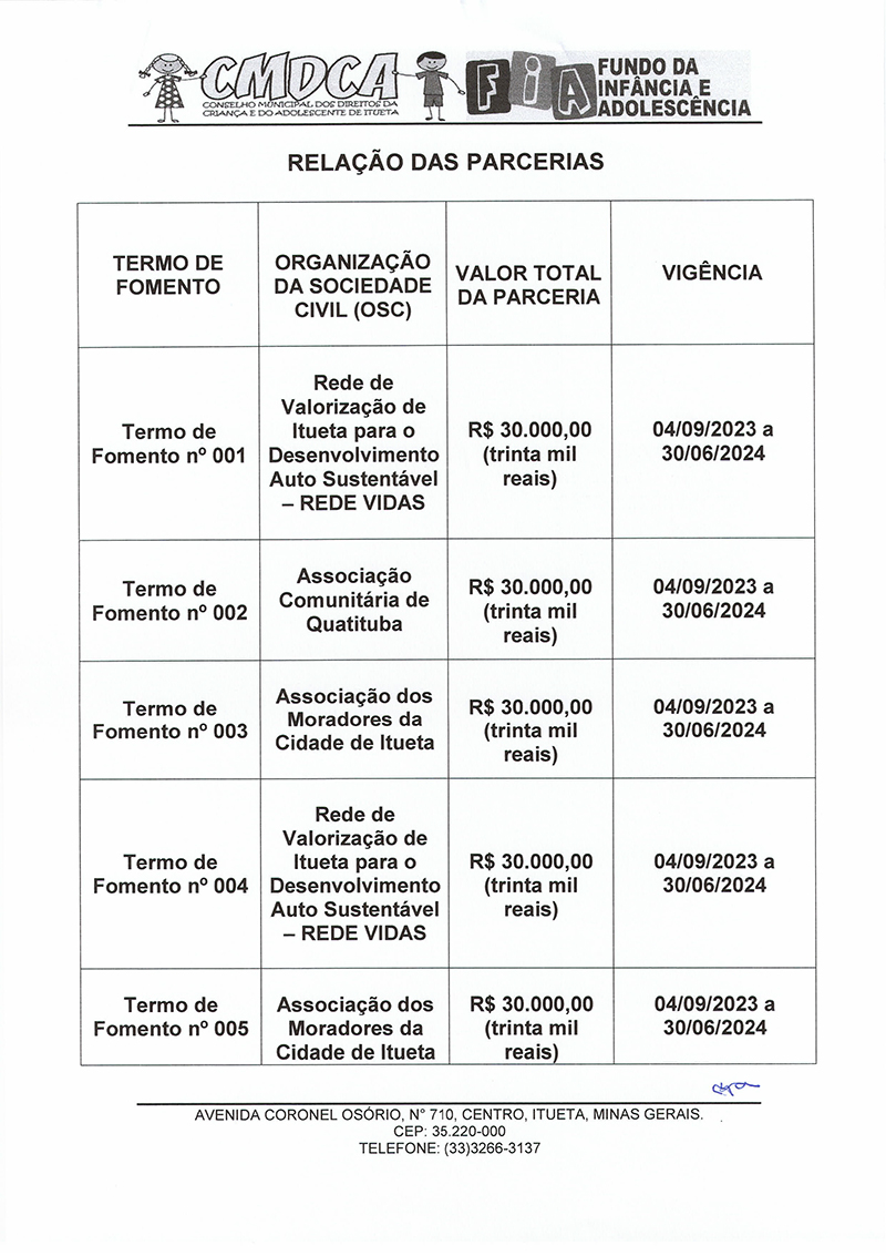 MUNICÍPIO DE ITUETA, situado na Praça Antônio Barbosa de Castro, nº. 35, Centro, CEP nº. 35.220-000, por intermédio da Secretaria Municipal de Assistência Social, Trabalho e Habitação - Conselho Municipal dos Direitos da Criança e do Adolescente - CMDCA, torna público a presente RELAÇÃO DE PARCERIAS do Edital de Chamamento Público, das Organizações da Sociedade Civil que celebraram Termo de Fomento que tem por objeto a execução de projetos com as atividades relacionadas no edital.