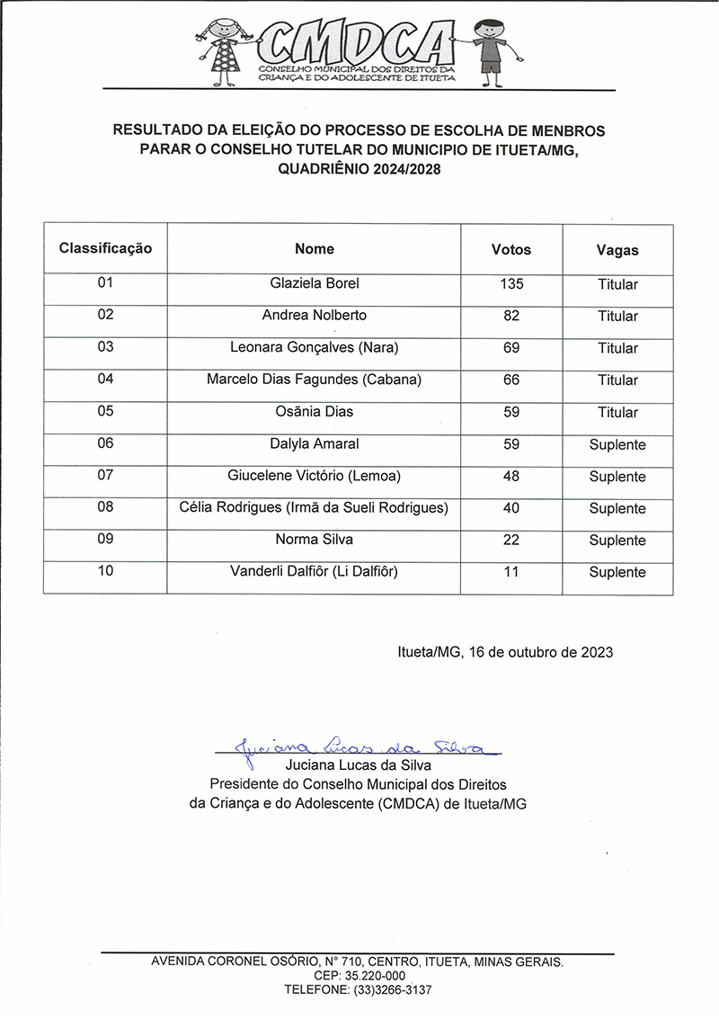 A PREFEITURA MUNICIPAL DE ITUETA-MG, por intermédio do Conselho Municipal de Direitos da Criança e do Adolescente – CMDCA, torna público a Divulgação do RESULTADO DA ELEIÇÃO do processo de escolha de membros para o Conselho Tutelar do município de Itueta/MG, quadriênio 2024/2028.