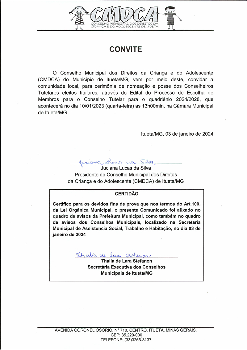 A PREFEITURA MUNICIPAL DE ITUETA-MG, por intermédio do Conselho Municipal de Direitos da Criança e do Adolescente – CMDCA, CONVIDA a Comunidade local, para cerimônia de nomeação e posse dos Conselheiros Tutelares, quadriênio 2024/2028.