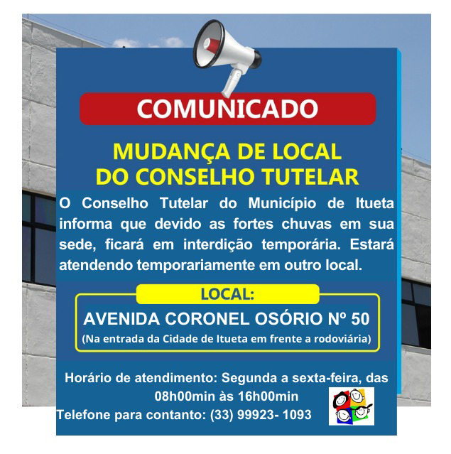 A PREFEITURA MUNICIPAL DE ITUETA-MG, por intermédio do Conselho Municipal de Direitos da Criança e do Adolescente – CMDCA, COMUNICA a Comunidade local, que o Conselho Tutelar está atendendo em novo endereço: