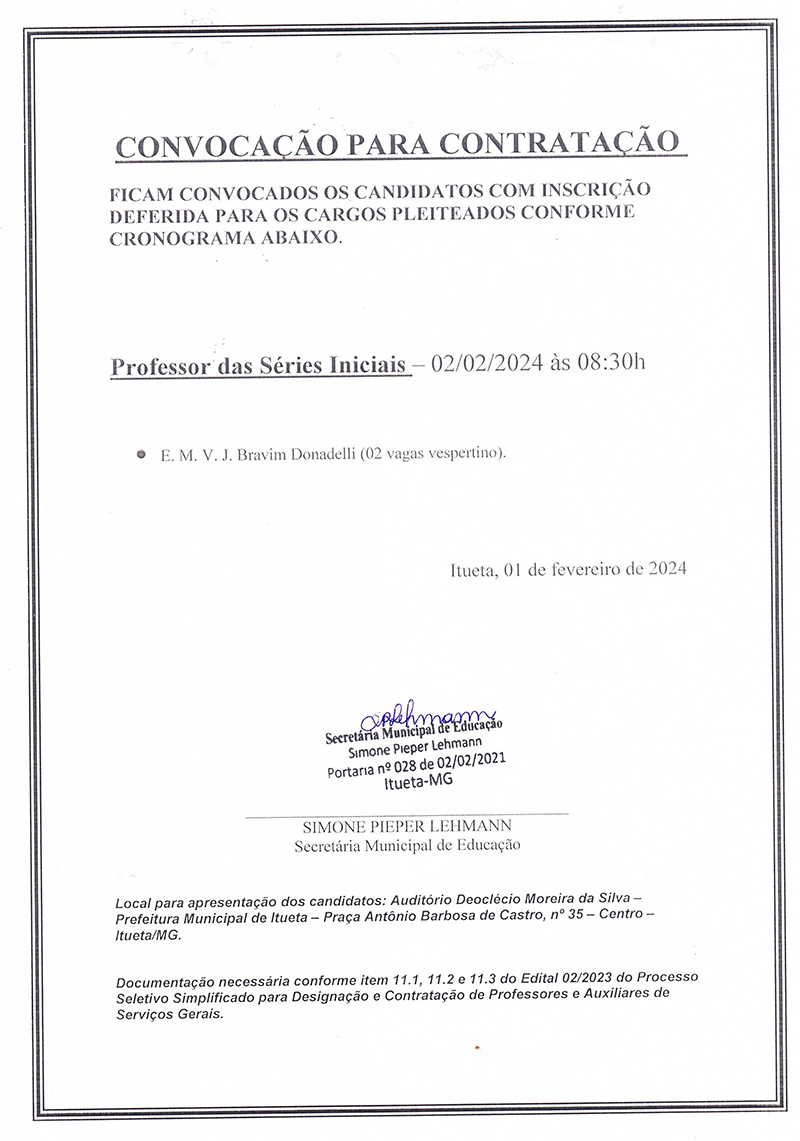 CONVOCAÇÃO PARA CONTRATAÇÃO - (Professor das Séries Iniciais) Processo Seletivo Simplificado - Edital nº 002/2023