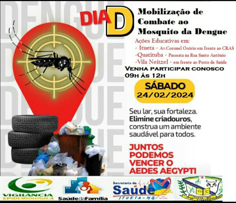 A Secretaria Municipal de Saúde de Itueta está coordenando, por meio das Unidades de Saúde, o Dia D contra a Dengue, que será realizado neste sábado (24/2).