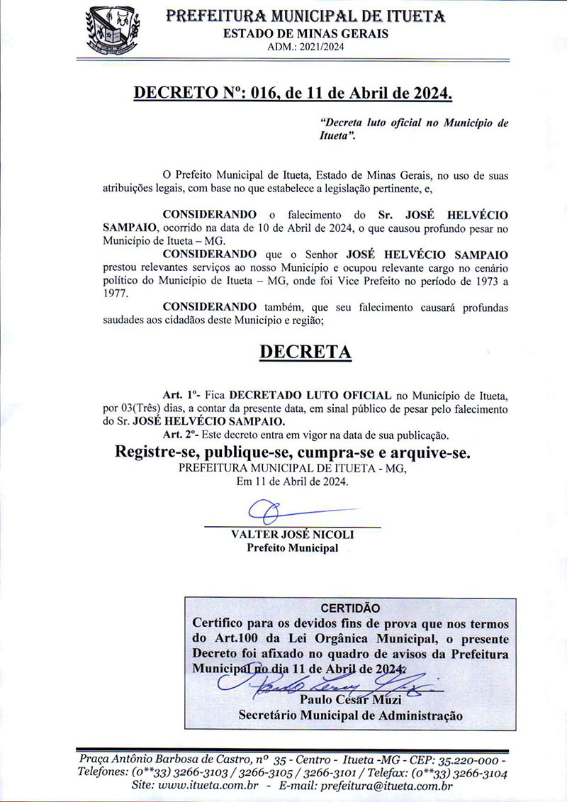O Prefeito Municipal Valter José Nicoli, profundamente consternado pelo falecimento do Sr. José Helvécio Sampaio, ex-vice-prefeito de Itueta, ocorrido ontem, 10, vem por meio do Decreto nº 016, de 11 de abril de 2024 decretar Luto Oficial de (03) três dias no município.