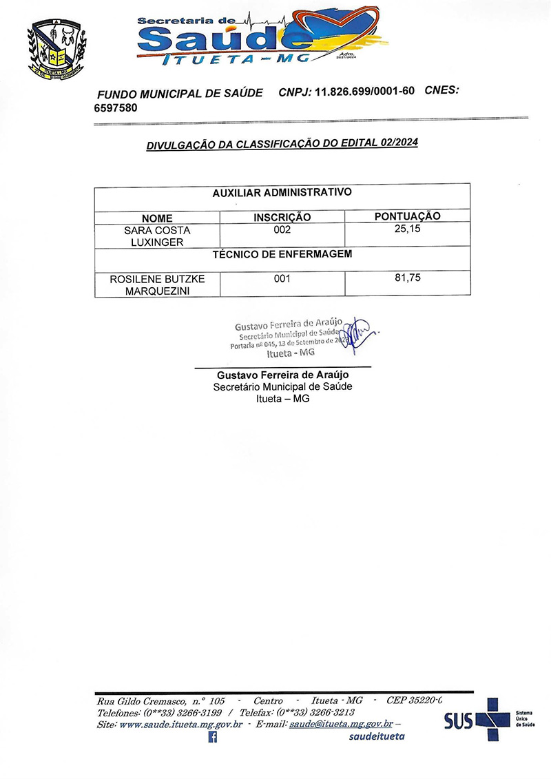A Secretaria Municipal de Saúde de Itueta – MG, no uso de suas atribuições legais, conferidos pela Lei Orgânica Municipal e Lei Complementar Municipal nº 002, de 04 de abril de 2011, TORNA PÚBLICO, o RESULTADO DA CLASSIFICAÇÃO DO EDITAL.