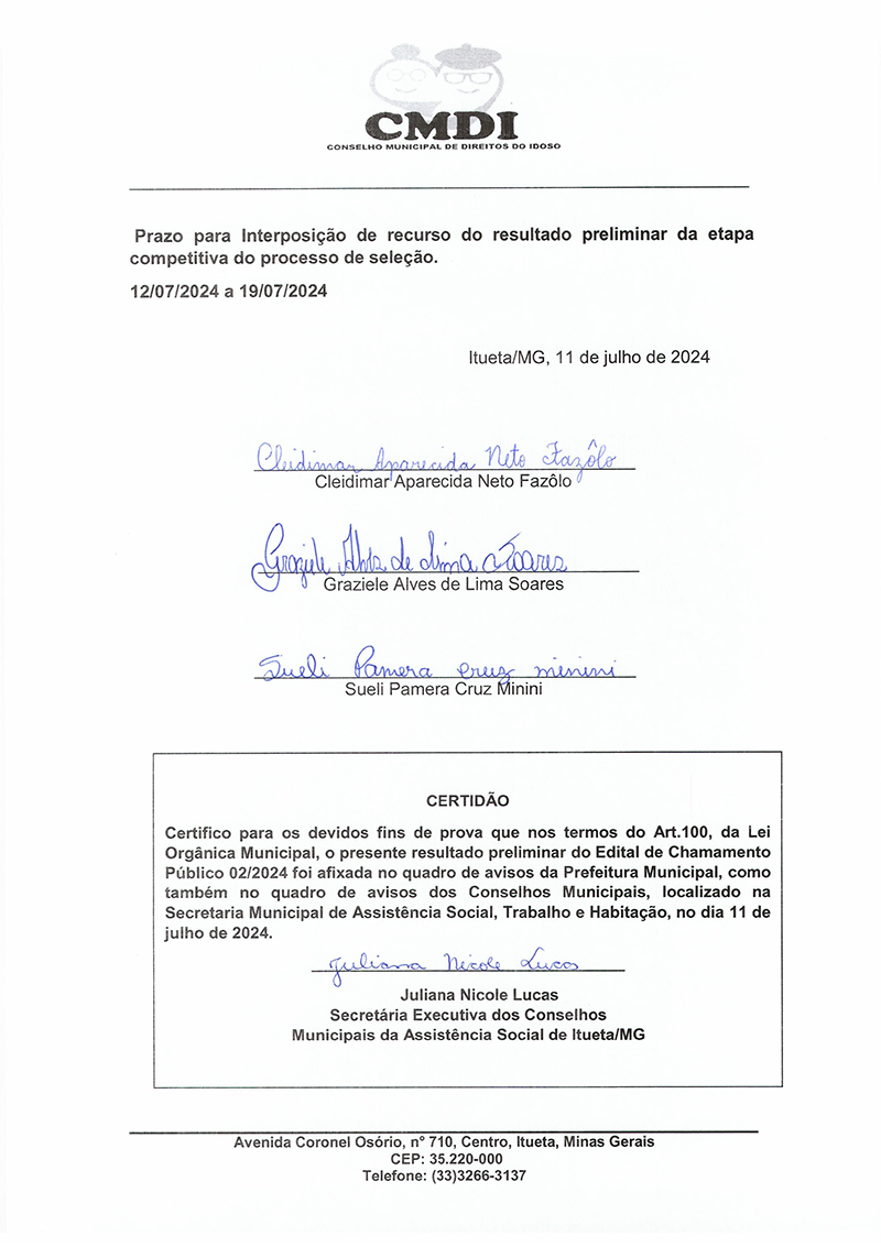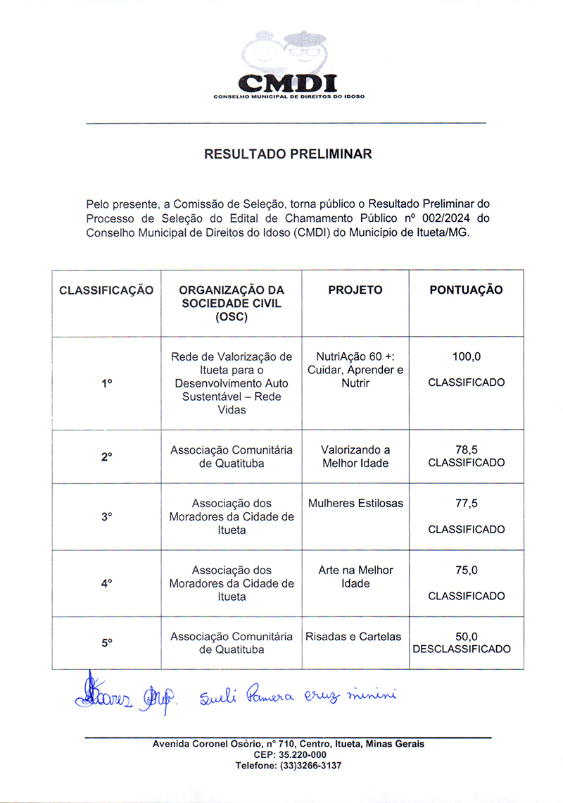 A PREFEITURA MUNICIPAL DE ITUETA-MG, por intermédio do Conselho Municipal de Direitos do Idoso – CMDI, com esteio na Lei Federal nº 13.019, de 31 de julho de 2014, torna público o RESULTADO PRELIMINAR do Edital de Chamamento Público visando à seleção de propostas de organizações da sociedade civil interessadas em celebrar Termo de Fomento que tem por objeto a execução de projetos com as atividades relacionadas nesse edital.