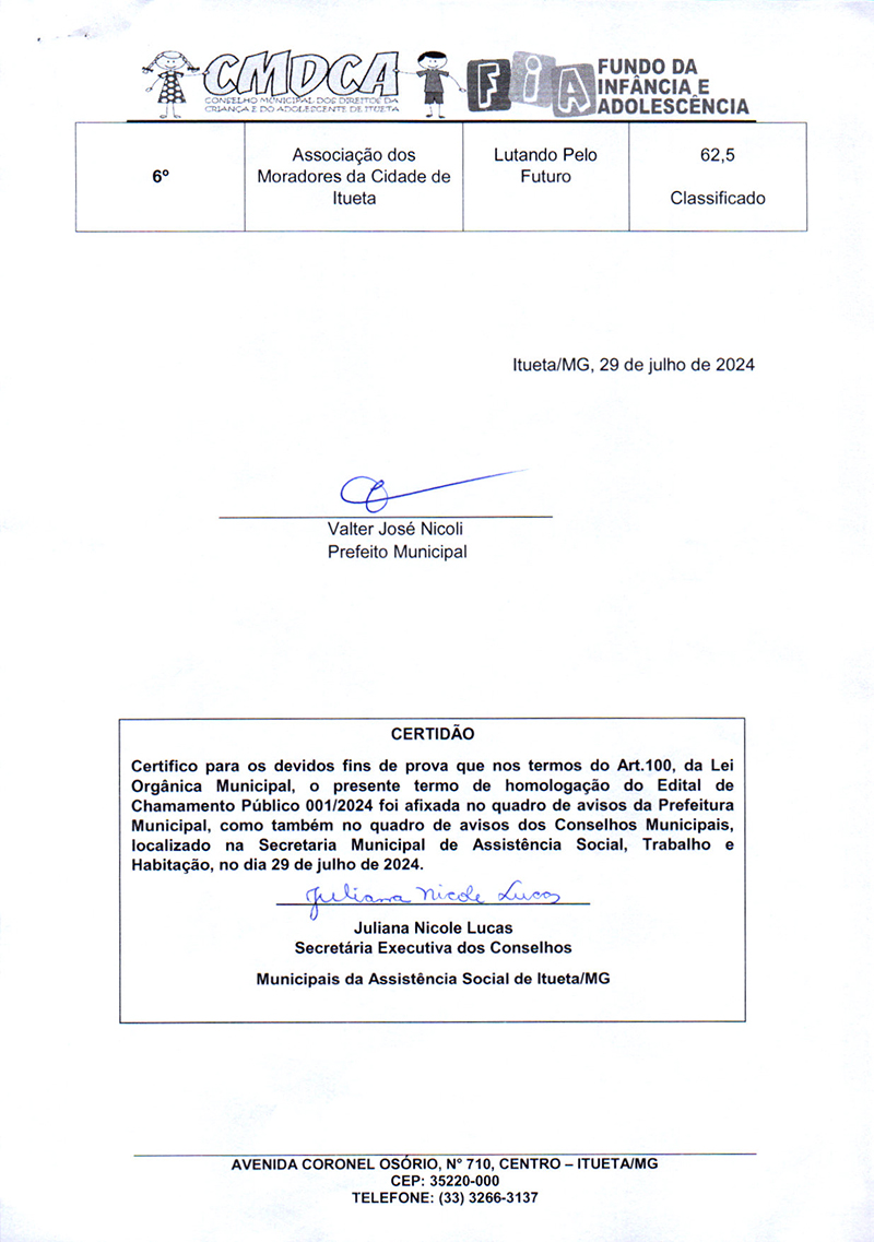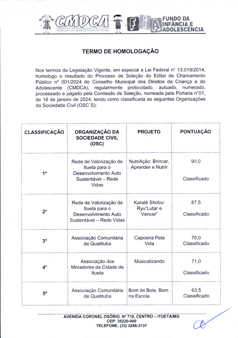 A PREFEITURA MUNICIPAL DE ITUETA-MG, por intermédio do Conselho Municipal de Direitos da Criança e do Adolescente – CMDCA, com esteio na Lei Federal nº 13.019, de 31 de julho de 2014, torna público o presente TERMO DE HOMOLOGAÇÃO - Edital de Chamamento Público visando à seleção de propostas de organizações da sociedade civil interessadas em celebrar Termo de Fomento que tem por objeto a execução de projetos com as atividades relacionadas nesse edital.