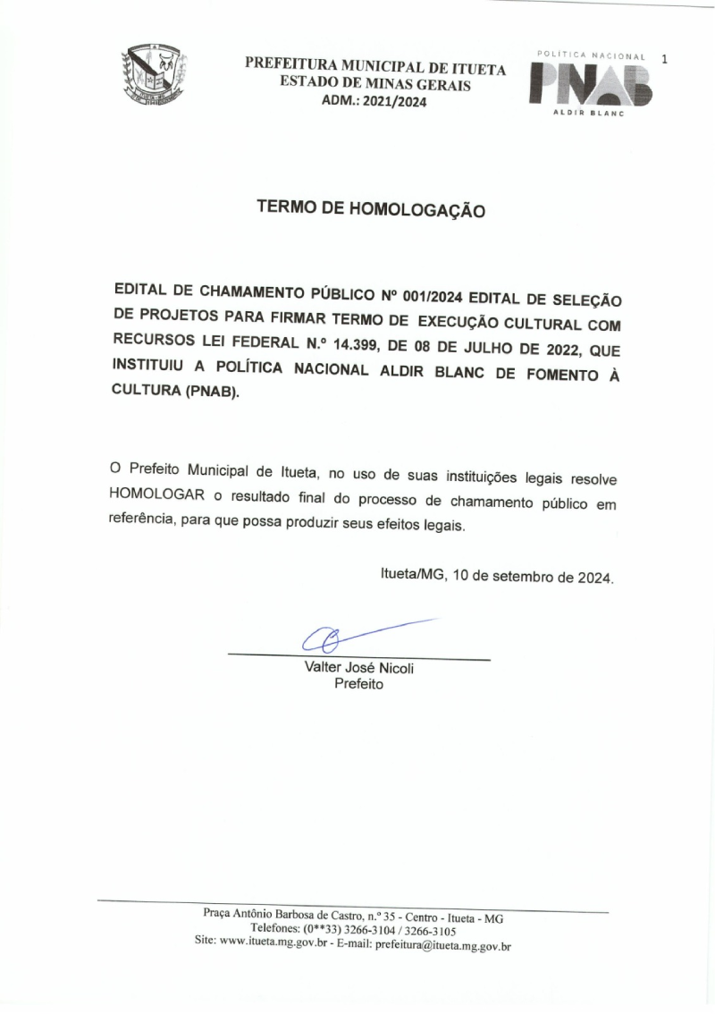 A Secretaria Municipal de Cultura de Itueta, juntamente com o Conselho Municipal de Política Cultural (CMPC) do Município de Itueta, torna público o Termo de Homologação do Edital de Chamamento Público n.º 01/2024 da Secretaria Municipal de Cultura de Itueta: