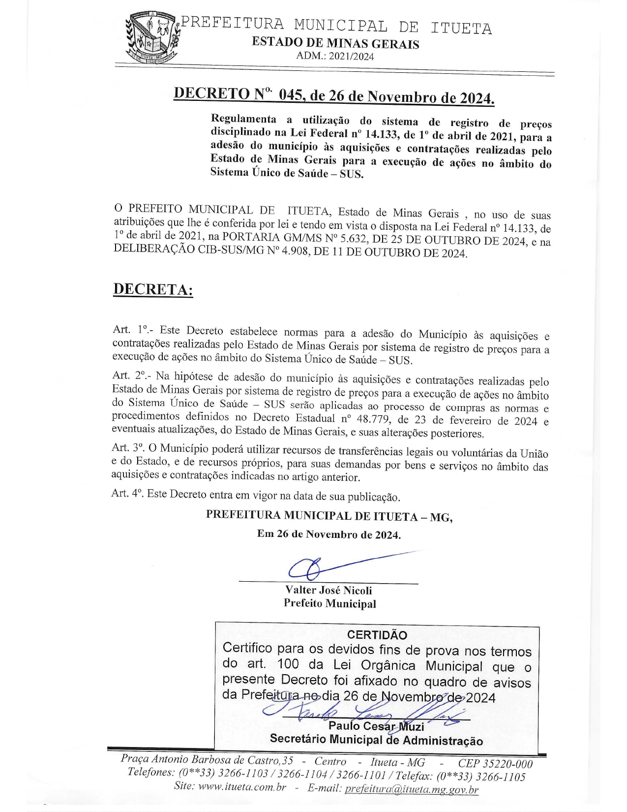 Página inicial > Últimas Notícias > DECRETO Nº 045, DE 26 DE NOVEMBRO DE 2024