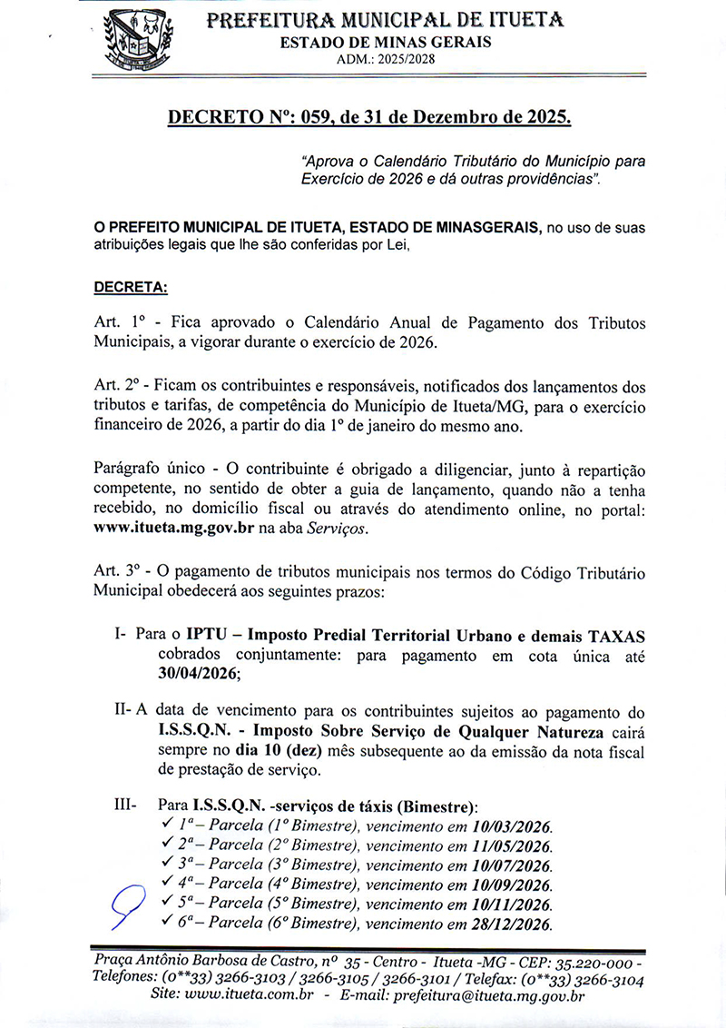 “Aprova o Calendário Tributário do Município para Exercício de 2026 e dá outras providências”.