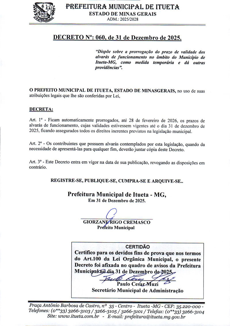 Página inicial > Últimas Notícias > DECRETO Nº 060, DE 31 DE DEZEMBRO DE 2025
