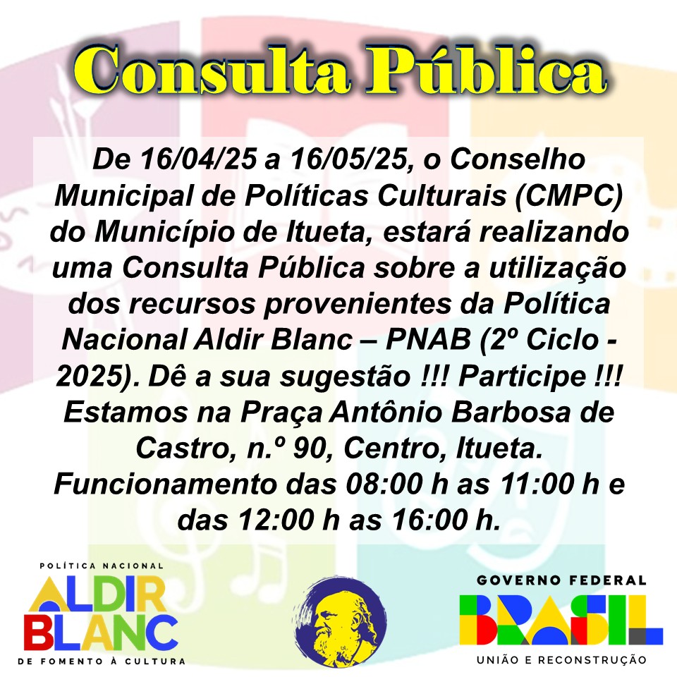 Conselho Municipal de Políticas Culturais (CMPC) do Município de Itueta, estará realizando uma Consulta Pública sobre a utilização dos recursos provenientes da Política Nacional...