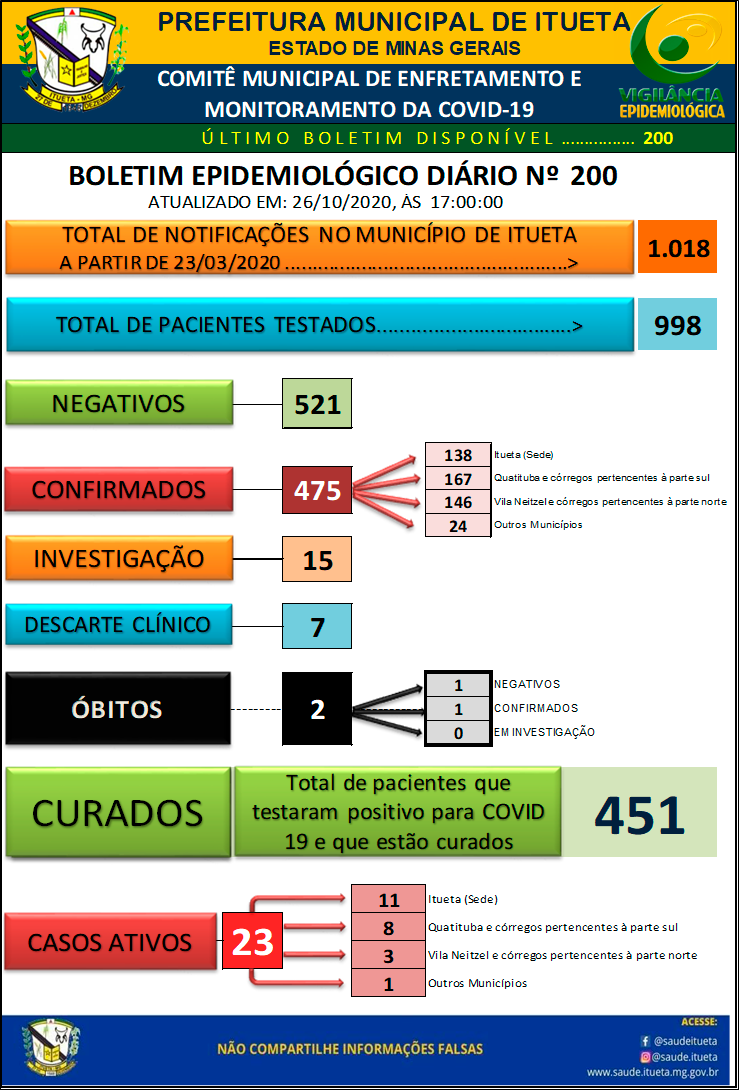 🚓 Se estiver como suspeito ou testado positivo NÃO saia de casa, pois constitui infração do Art 268 do Código Penal com pena de detenção de 1 mês a 1 ano e multa.