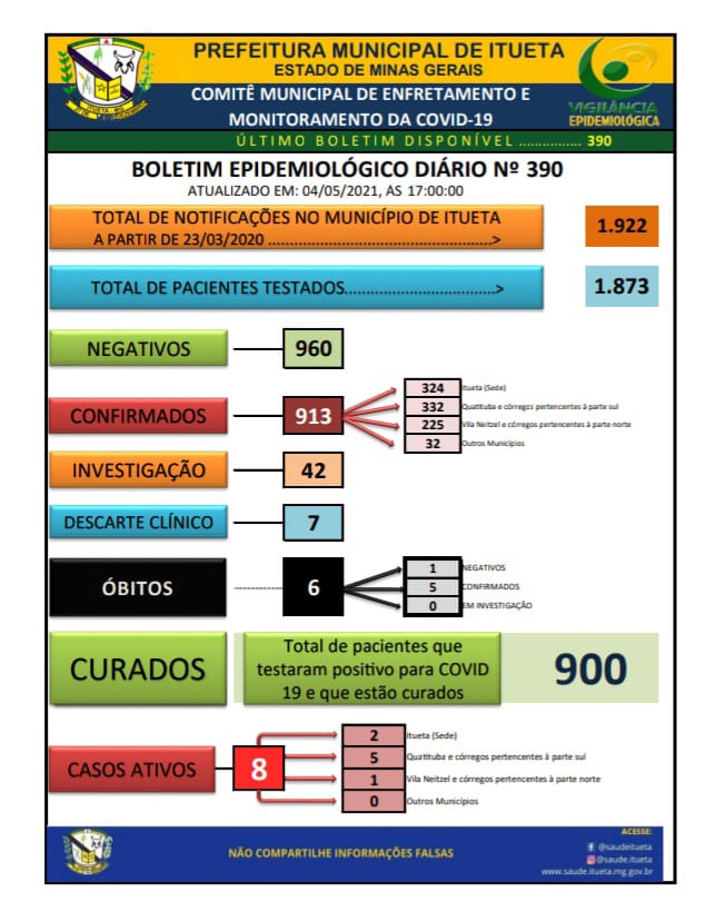 Destacamos a inclusão de 04 casos positivos em CURADOS.