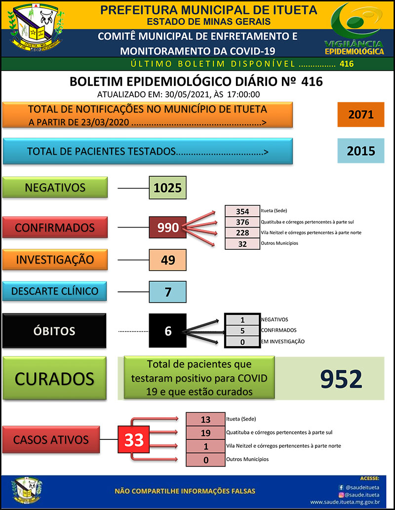 Boletim Epidemiológico sem alteração no dia de hoje.Dados abertos: Baixar planilha em formato excel. Clique aqui